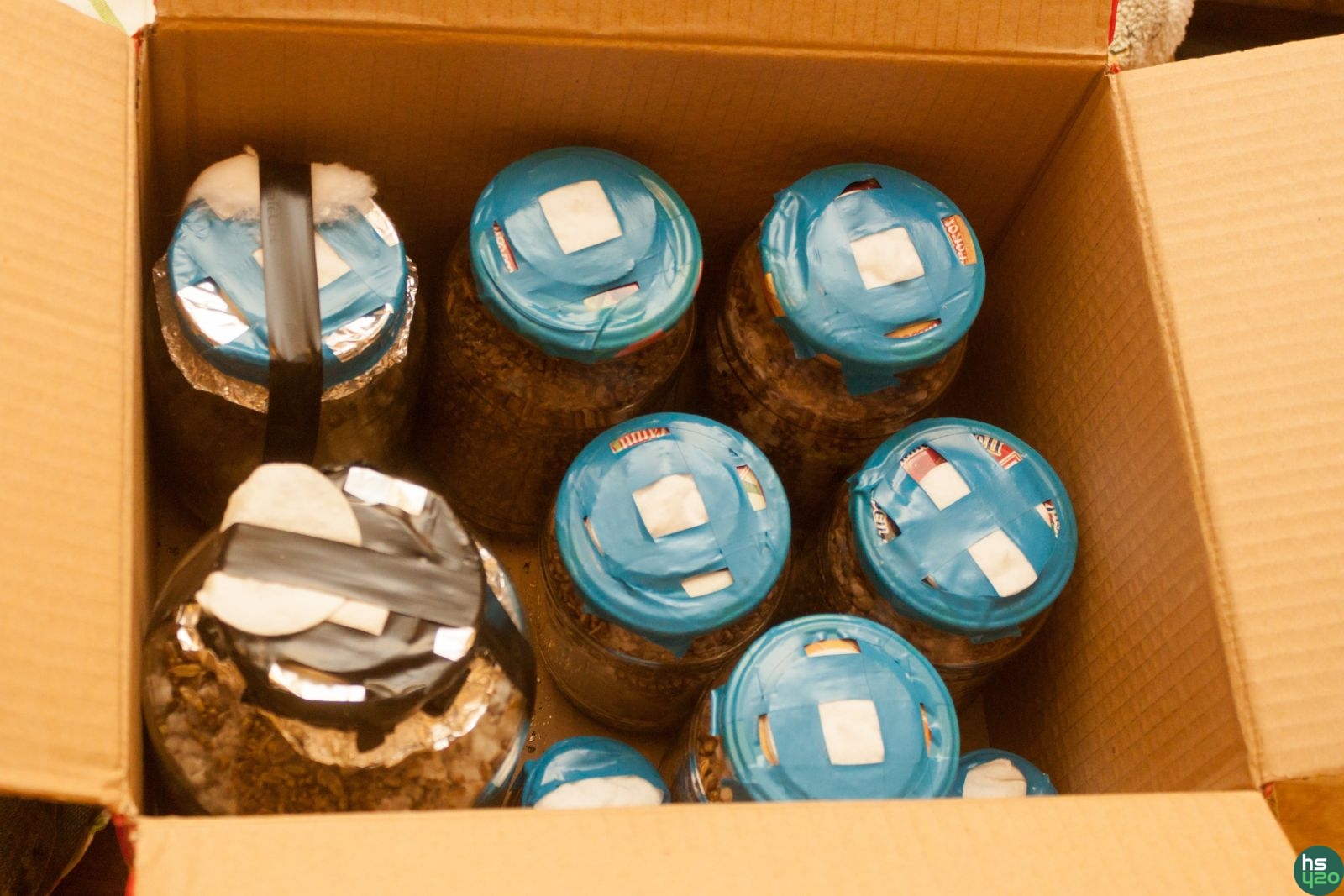 Банки в одной из коробок. Удобнее, чем фольгой заворачивать от света.